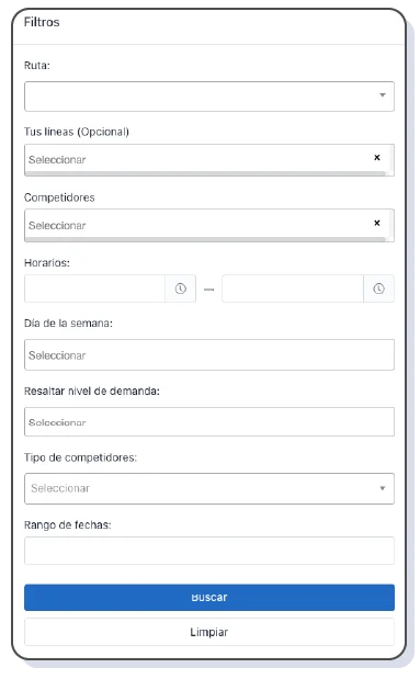 2. Practicidad: Simplifica tu proceso de toma de decisiones al tener todos los datos relevantes en una única tabla comparativa. Con filtros intuitivos, como ruta, base de servicio, competidor, horario y días de la semana, puedes refinar fácilmente tu búsqueda para obtener información específica.